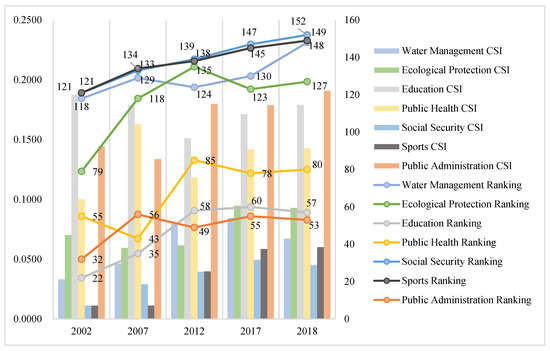 Among these, the public services that are mostly concerned with and most needed by the majority of urban and rural residents are education, health, and social security. These services must be provided in order to establish a social safety net and to protect the basic rights of survival and development of all members of society. Specifically, the Chinese government has always attached great importance to these services. In fact, education has always been highly influenced, ranking among the top 5 almost every year; that is, from the perspective of the level of commitment of resources, investment in the education sector is obtained quite adequately. However, it is not proportional to the output to input, the impact force is quite small, and it is far from being able to play its fundamental and leading role in economic development and national rejuvenation. Further, the problem with the social security industry is that the resources invested and the impact are quite insufficient. This is mainly because the content of the state’s direct management in China’s social security management system is quite high, and the participation of all parties in society, including enterprises, is not high, and the socialization component is insufficient.
