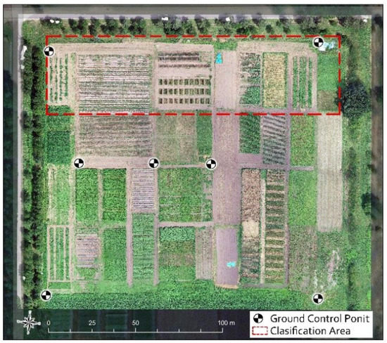 Aerial image of the experimental field with the classification verification site marked by the red dotted line.