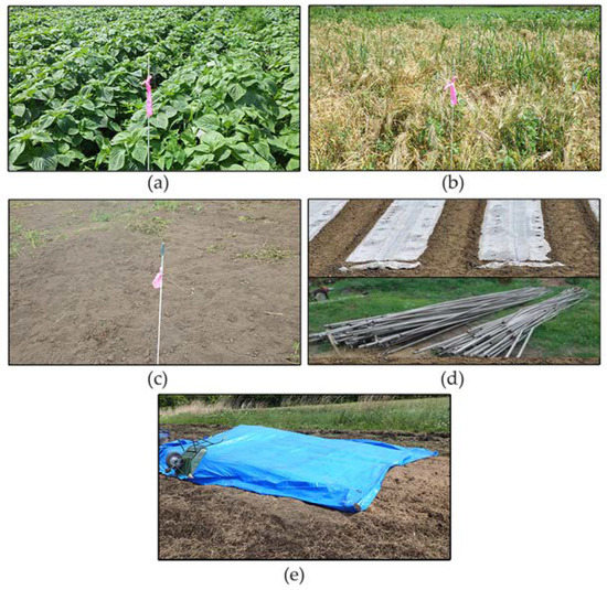 The ground objects at the study site: (a) vegetation; (b) dead/weakened vegetation; (c) soil; (d) multi-sheet and metal; (e) plastic blue sheet.
