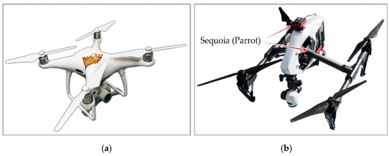 Unmanned aerial vehicles (UAVs) used for the aerial surveys: (a) Phantom 4 Pro (DJI); (b) Inspire 1 (DJI) with Sequoia (Parrot).