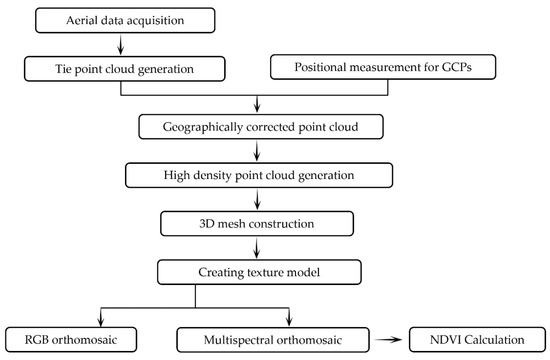 The Structure from Motion (SfM) technology can reconstruct the 3D structure of the object surface based on multiple, overlapping images taken by a moving camera. In the present study, the SfM process of the UAV images was conducted using Agisoft Metashape Professional Edition (ver. 1.8.0, Agisoft). The image processing workflow is illustrated in Figure 4. After obtaining the aerial images using UAVs and importing them into the software, a tie point cloud was generated by aligning the images and finding the characteristic points existing in the overlapping areas between the images. Then, the position information of the GCPs obtained from the GNSS measurements was imported into the software and matched with the anti-aircraft signals in the images, which corrected the tie point cloud to the accurate geographic location. Based on the initial process results, a dense point cloud was generated based on depth maps calculated using dense stereo matching. Because generating the dense cloud was the most time-consuming step of the SfM process and the higher the density of the point cloud, the more complicated the subsequent calculations would be, in the present study, a medium-quality dense cloud was generated. Based on the dense cloud information, a 3D polygonal mesh was constructed by connecting the points with polygonal surfaces. After the surface model was constructed, a texture model was created by extracting the RGB color value and calibrating the brightness and white balance, giving the 3D model the same visual appearance as that of the actual object. Finally, based on the texture model, the RGB and multispectral (red and near-infrared) orthomosaics were exported. The ground resolution of the final products of the SfM procedures was 1.6 cm for panchromatic and 4.2 cm for multispectral products. The NDVI raster was then calculated using the Raster Calculator geo-processing tool in ArcGIS Pro (ver. 2.4.1, Esri).