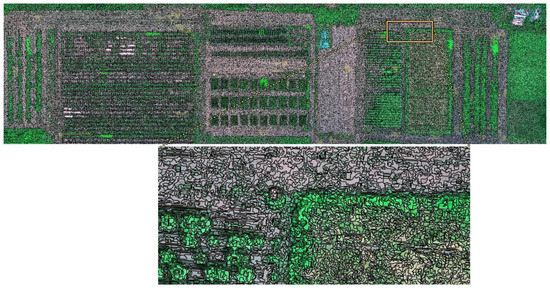 The OBIA can classify image objects by dividing the entire image into small segments according to their shape, size, and spectral content. The software used for this method was eCognition Developer (ver. 9.0, Trimble). First, a new project including the RGB orthomosaic, red band reflectance orthomosaic, near-infrared reflectance orthomosaic, and NDVI raster was created in the software, and was displayed as one RGB-mixed layer in the workspace, where the near-infrared was displayed as green and NDVI as red. Next, the mixed image was separated into multiple segments using the Multiresolution Segmentation tool. The scale factor, which decides the average size of the segments and is commonly set between 100 and 150 for high resolution UAV images [25], was set to 100 in the present study to obtain the classification result as precisely as possible. The result of segmentation is shown in Figure 5. Then, five classes were created inside the Class Hierarchy window and 80 to 200 segments for each class were selected as training samples using the Select Samples tool. Finally, the classification was conducted according to the mean RGB value, mean brightness, standard deviation RGB, position, and shape of the mixed layer.