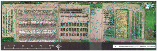 The accuracy assessments for the classification results of the three methods were performed with ArcGIS Pro. First, the orthomosaic and classification raster from the classification methods were input into the software. Next, a point shapefile with 1000 assessment points was created using the Creating Accuracy Assessment Point geo-processing tool (Figure 6). The attribute table of the created point shapefile included both the Ground Truth field, which is the reference value, and the Classification Field, which is the test value. The reference value was determined by visual judgement, by zooming into the point position and deciding manually to what class the point belonged. The visual judgement was also conducted at the pixel level, which means the tolerance of error was less than 2 cm. The test value was extracted from the classification raster using the Extract Values to Points geo-processing tool. Finally, the accuracy assessment for each classification result was conducted using the Compute Confuse Matrix geo-processing tool, by calculating the user’s accuracy, the producer’s accuracy, and the Kappa coefficient.