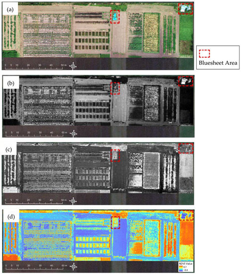 As shown in Figure 7c, the vegetation area was clearly visible at the near-infrared orthomosaic, because the chlorophyll in healthy vegetation strongly reflects the near-infrared wavelength and appears as fluorescence in the near-infrared image. Even for the weakened vegetation, a small amount of chlorophyll still produced a visible fluorescence. This fact makes the near-infrared band an important indicator for vegetation in the remote sensing field. However, objects other than vegetation have no significant reflectance characteristic at the near-infrared, which resulted in the similar appearance of soil, multi-sheet, metal, and blue-sheet in the near-infrared orthomosaic. Because NDVI is a normalized value of the difference between the reflectance of the red and near-infrared bands, the NDVI raster shows more features of different objects that have specific characteristics in terms of red or near-infrared band reflectance.