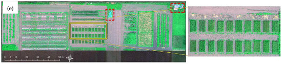 Figure 7 shows the RGB orthomosaic, red band orthomosaic, near-infrared orthomosaic, and NDVI raster generated from the UAV image, and the mixed RGB image in eCognition Developer, which were the photogrammetry products used for the subsequent classification. The characteristic of each product was the basis for the different performances of the three methods.