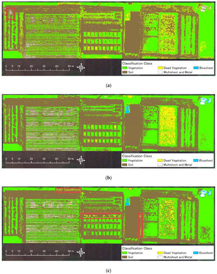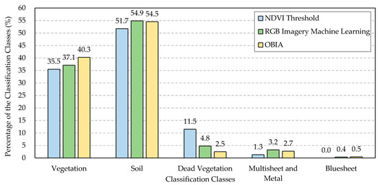 As shown in Figure 7a, in the RGB orthomosaic, the vegetation, multi-sheet and metal, and blue sheet had characteristic RGB values that could be expressed clearly and distinctly. However, the RGB values of soil and weakened vegetation were close to each other, resulting in a similar visual appearance. Specifically, the average RGB values of soil were 223, 209, and 190, respectively, whereas those of the weakened vegetation were 217, 204, and 174, respectively, for ten randomly selected sample pixels. This fact suggested that the RGB orthomosaic had a disadvantage in distinguishing soil and weakened vegetation.