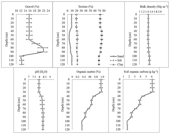 | Hor. | pH (H2O) | OM (%) | SOC (g kg−1) | SOC-S (Mg ha−1) | T-SOC-S (Mg ha−1) |