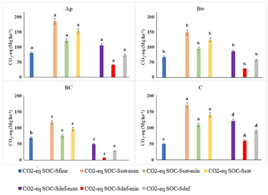 | CO2-eq (Mg ha−1) | CO2-eq = SOC-S (Mg ha−1) × (−3.67) [69,71] g |
