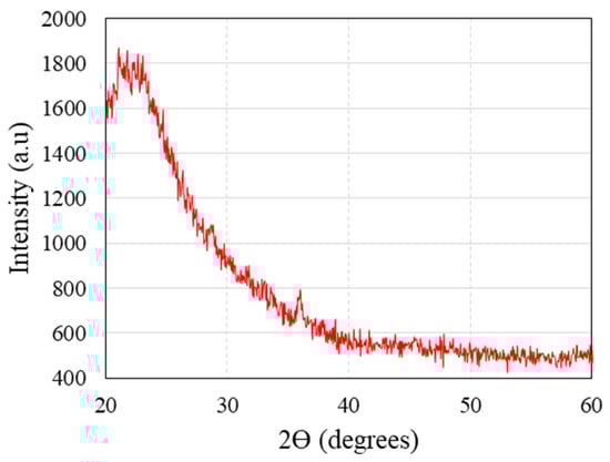 Silica fume (SF) was used as the secondary binder (by partial replacement of the primary binder). It is highly reactive and possesses a superior filling effect due to its specific surface area of around 27,000 m2/kg. SF particles are 70 times finer than Portland cement particles. Particle size distribution of both primary and secondary binders is illustrated in Figure 1. SF is almost entirely composed of silicon dioxide (SiO2). The X-ray diffraction (XRD) results revealed that ultra-fine SF shows an amorphous state, as shown in Figure 2. The XRD diffraction spectrum of the SF sample with the peak at around 2θ = 23° indicates the presence of micro-crystalline silica (a form of porous silicon) []. Scanning electron microscopic (SEM) images revealed that most particles in the SF sample had diameters of less than 1 micron, as shown in Figure 3. This qualified it as a ‘micro-binder’ suitable for filling the gaps between the particles of the main binder.
