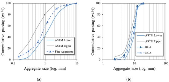 Gradation charts: (a) fine aggregate; (b) NCA and RCA.
