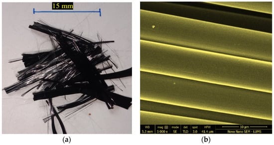 To enhance the tensile properties of RAC, CF was used as fiber reinforcement. The length and diameter of the CF were 15 mm and 7 microns, respectively. The length of the CF was decided considering the workability issues associated with longer filament lengths and the fact that shorter lengths yield insignificant effects on the ductility response of concrete []. Thus, a medium length of 15 mm was chosen for the CF. The tensile strength value of CF is above 3000 MPa, and it has an elastic modulus of 230 GPa. The material density of CF is 1800 kg/m3. The macro–micro overview of CF is shown in Figure 5.