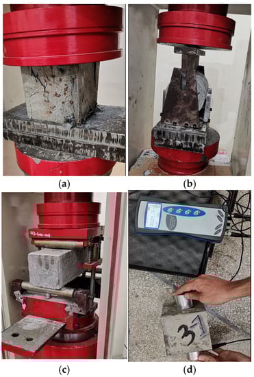 The overview of experimental testing: (a) compression test; (b) splitting tensile test; (c) bending test; and (d) pulse velocity test.