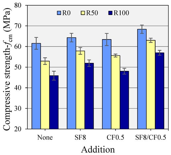 The combined use of CF and SF augmented the fcm of concrete by significant margins. As is shown in Figure 8, around an 11% improvement in fcm of R0 can be achieved by using 8% SF and 0.5% CF. Due to the combined use of CF and SF, R0, R50, and R100 concrete experienced 11%, 16%, and 18% improvements, respectively. It was clear that SF and CF have synergistic benefits since the benefits of their combined incorporation were marginally greater than the sum of the benefits due to their singular incorporations. R50/SF/CF showed an fcm comparable to that of the control mix.