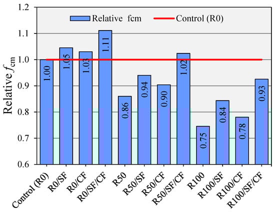 Relative fcm of concrete mixes with SF, CF, and RCA.