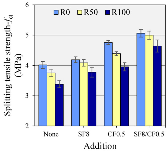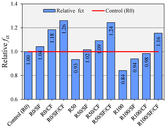 In practical engineering, fct is measured instead of direct tensile strength since it provides a simpler and easier assessment of the tensile strength of concrete. Figure 9 shows the effect of SF and CF on the fct with and without incorporation of RCA, while the fct value of all mixes relative to the control mix is shown in Figure 10. A downward trend was noticed in fct, increasing the percentage of RCA. The fct decreased by 7% and 16% at 50% and 100% RCA, respectively. These reductions in fct were anticipated due to the inherent weakness of RCA. The incorporation of SF provided minor improvements in the fct. The fct of R0, R50, and R100 was improved by 4%, 9%, and 10%, respectively, due to the inclusion of SF as an 8% replacement of cement. The pozzolanic reactions and filler effect of micro-silica particles strengthen the binder matrix. In the case of mixes incorporating RCA, the chemical reactions may also occur across the bond between silica-modified matrix and aggregates. Kurda et al. [] systematically showed that the utilization ratio of pozzolanic binders is greater in the case of RAC than in NAC.