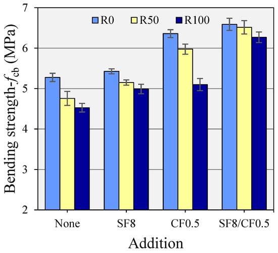 Similar to fct, fcb is an indirect measure of the true tensile strength of plain and fibrous concretes. However, unlike fct, fcb can be directly used in the design of concrete elements such as tunnels, slabs, pavements, etc. Unlike fcm and fct, fcb is not a simplistic measure as it requires high-quality control and is strongly influenced by the support conditions, fiber orientations, and sample size. The effect of RCA, CF, and SF addition on fcb is illustrated in Figure 11. The fcb values of all mixes relative to the control mix are presented in Figure 12.