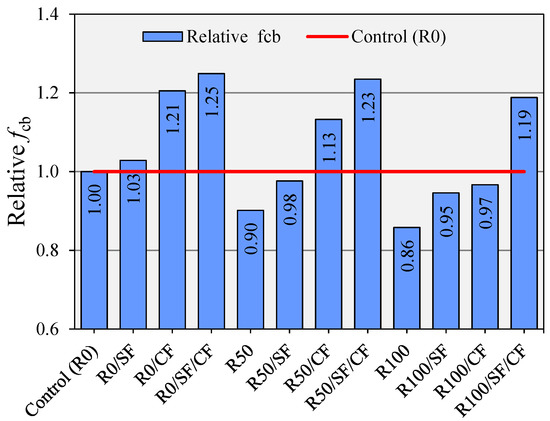 Relative fcb of concrete mixes with SF, CF, and RCA.