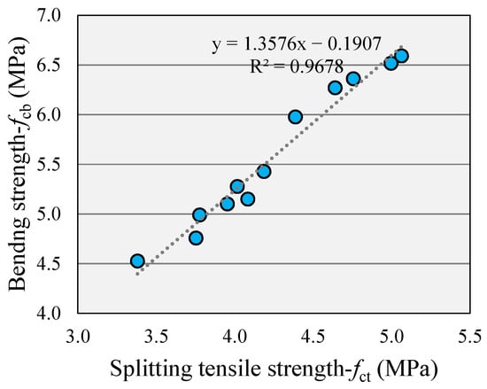 The variation in fct and fcb with the incorporation of RCA, SF, and CF almost showed a similar trend. The crack-bridging effect of fiber is highly useful for both tensile properties of concrete; therefore, the fct and fcb correlated with high accuracy, as shown in Figure 13. As we know that fcb measurement is difficult and sensitive, it can be assessed accurately from the fct.