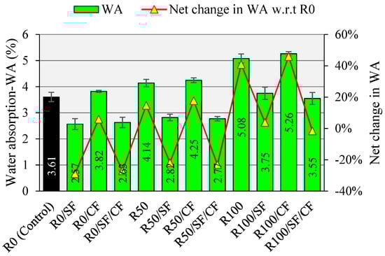 The change in the permeable porosity of concrete can be used as a durability indicator because the ingress rate of harmful chemicals is entirely dependent on the porosity of the concrete. The results of WA testing are illustrated in Figure 14. RCA incorporation is detrimental to the porosity of concrete due to the attached mortar. The pores present inside RCA increase the connectivity of micro-channels, leading to an increased value of WA. At full replacement of NCA with RCA, a 40% increase in the WA capacity of concrete was noticed. This drawback of high porosity and loosely attached mortar associated with RCA also had a detrimental effect on the mechanical properties of concrete. A secondary binder, such as SF, due to its micro size, effectively closes the spaces in the binder matrix and on the surface of RCA. The meandering effect of fine particles also slows or reduces the penetration of water inside the concrete [,]. The improvement in the interfacial properties of concrete results in a tremendous WA reduction.