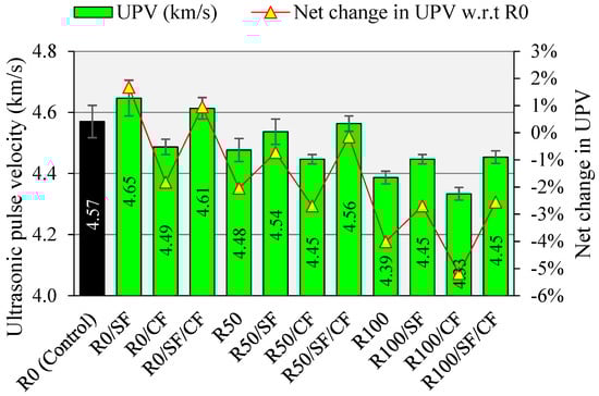 To assess the quality of concrete in the field, UPV is widely used as a non-destructive testing method. Table 3 provides the interpretation of UPV value in terms of concrete quality as per BIS: 13311 []. A UPV value between 3.5 and 4.5 km/s usually corresponds to normal-strength and medium-strength concretes, whereas UPV values above 4.5 km/s correspond to high-performance or high-strength concrete grades. The results of UPV testing of all mixes are illustrated in Figure 15. The control mix showed a UPV value above 4.5 km/s, which shows its excellent quality. The inclusion of SF refines the micro-structure and improves the imperviousness of concrete, which leads to further improvement in the UPV value of concrete. Unlike SF, fiber addition has a downward effect on the UPV of concrete. The increase in porosity due to fiber addition may reduce the speed of the pulse []. The reduction in UPV value can also be linked to the increase in heterogeneity on fiber addition. A mix containing both SF and CF attained a UPV value similar to that of the control or unmodified mix. SF balances the negative effect of micro-fibers on UPV.