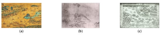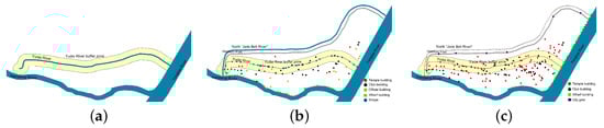 Distribution of the water system and historical relics in the Hankou area: (a) The buffer zone of “Yudai River” and the historical sites in 1635; (b) The buffer zone of “Yudai River” and historical sites in 1864; (c) The buffer zone of “Yudai River” and historical sites in 1905.