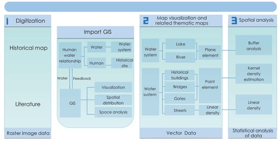 In this study, the technique of data spatial analysis and visualization of GIS is used to describe and evaluate the human–water relationship in Hankou. The framework of the method is proposed in Figure 3. The method is divided into three parts: collection and digitization operation of historical maps, map visualization, related thematic maps, and spatial analysis Figure 3.