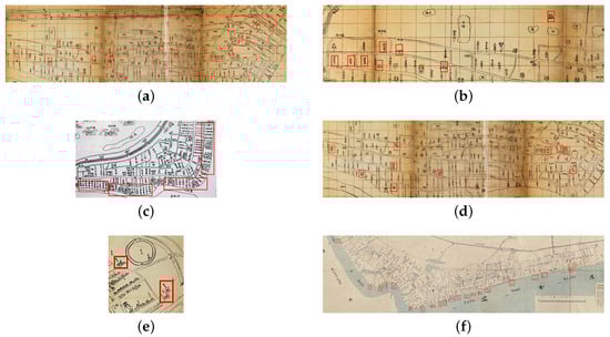 Point element information in historical maps. (a) Guildhalls in the historical map. Image source: This drawing is based on the 1864 “Wuhan City Map (Hankou). (b) Temple buildings in the historical map. Image source: This drawing is based on the 1864 “Wuhan City Map (Hankou)”. (c) Wharf buildings in the historical map. Image source: This drawing is based on the 1868 “Hankou Street Map of the Continuing Hanyang County”. (d) Official buildings in the historical map. Image source: This drawing is based on the 1864 “Wuhan Town Map (Hankow)”. (e) Official buildings in the historical map. Image source: This drawing is based on the 1877 “ Hankou Town Street Map of Hubei”. (f) Wharf buildings in the historical map. Image source: This drawing is based on the 1909 “Plan of Hankow”.