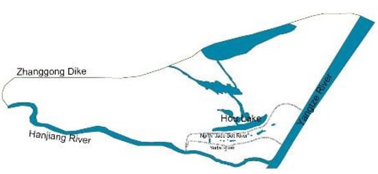 From 1864–1905, it changed from two rivers (Hanjiang River and Yangtze River) and their tributary (North Yudai River) to two rivers (Hanjiang River and Yangtze River) and one lake (Houhu Lake).