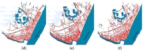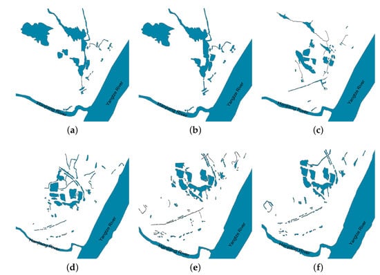 The spatial-temporal evolution of the Hankou water system from 1905 to 1949. From the top left corner to the bottom right one, the time is 1915, 1924, 1927, 1932, 1938, 1949, respectively. (a) the distribution of the water systems in 1915; (b) the distribution of the water systems in 1924; (c) the distribution of the water systems in 1927; (d) the distribution of the water systems in 1932; (e) the distribution of the water systems in 1938; (f) the distribution of the water systems in 1949.