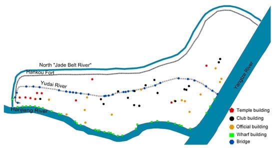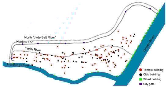 This study examines the spatial and temporal distribution of the artificial settlement sites (the locations of numerous sites left by ancient ancestors to explore their surroundings), including historical buildings, bridges, gates, and streets within the study area, which are derived from relevant historical documents, in which maps record the pertinent locations of artificial settlement sites. This study’s findings provide insight into human activities in the historical period of Hankou. In this study, such raster image data are manipulated for vectorization. Considering the long period of the study, typical historical maps are selected and imported onto the GIS platform to vectorize the information elements.