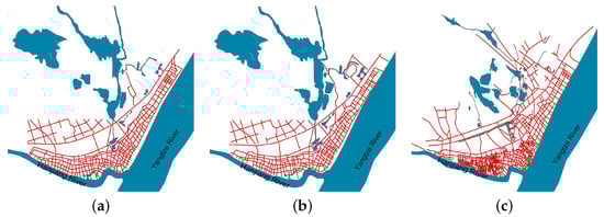 In the line density formula: R is the default radius value of GIS; is the line density value of the street line segment; is the length of the street in the street network; A is the area of the circle with default parameter radius R. Based on the relevant comparative study requirements and parameter settings, this study is conducted with the search radius R of 35.62 and the output pixel size of 4.27, respectively, for density analysis, to obtain the street–river system relationship map and its corresponding line density map during the period 1905–1949 in Figure 17.