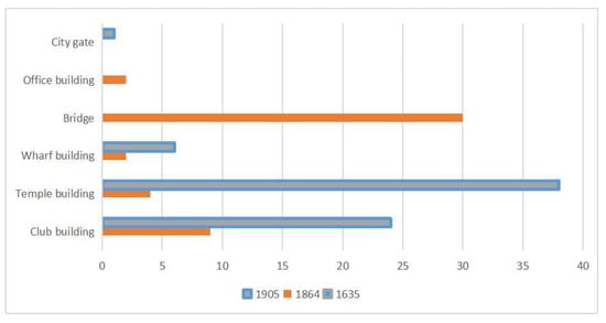 The river systems and artificial settlement sites within the same period in Hankou’s history are sorted out and spatially analyzed: in the buffer area formula, Oi is the river line segment of the Yudai River, R is the linear unit radius of 100, d is the minimum Euclidean geometric distance set by the original GIS parameters, and Bi is the set of all artificial settlement sites within the buffer area from the river line segment of the Yudai River. To quantify the river system and artificial settlement sites, the number of sites within the buffer area of the river systems is employed, and the distribution of the relationship between them over the period 1635–1905 is obtained Figure 14a–c and Figure 15.