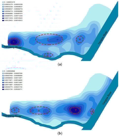 (a) Kernel density analysis of artificial settlement sites in Hankou during the period 1635–1864. (b) Kernel density analysis of artificial settlement sites in Hankou during the period 1864–1905.