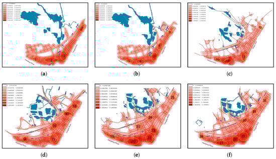 The Street layout and density analysis of the Hankou area from 1905 to 1949. From the top left corner to the bottom right, the time is 1915, 1924, 1927, 1932, 1938, 1949: (a) the Street layout and density analysis in 1915; (b) the Street layout and density analysis in 1924; (c) the Street layout and density analysis in 1927; (d) the Street layout and density analysis in 1932; (e) the Street layout and density analysis in 1938; (f) the Street layout and density analysis in 1949.