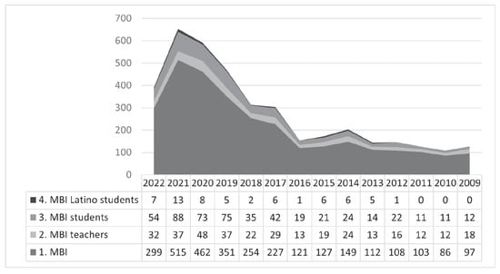 MBI research by year, WOS (2009–2022). Results WOS Core Collection as of 30 August 2022 with the criteria: (1) Maslach Burnout Inventory (topic), n = 3593; (2) Maslach Burnout Inventory (topic) + teachers (topic), n = 438; (3) Maslach Burnout Inventory (topic) + students (topic), n = 563, (4). Maslach Burnout Inventory (topic) + students (topic) + [Refined By: Brazil, Mexico, Chile, Colombia, Peru, Ecuador, Argentina, Paraguay], n = 60.