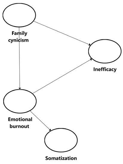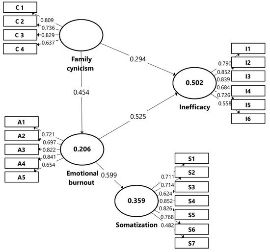 Figure 4 also allows us to appreciate the power of the relationship between constructs through the standardized path coefficients where it is expected to have values > 0.200, ideally above 0.300, to be considered significant. As can be seen, the most substantial relationship is = 0.599, between Emotional burnout and Somatization, and the lowest, but still relevant, is the relationship between Inefficacy and Family cynicism of = 0.294.