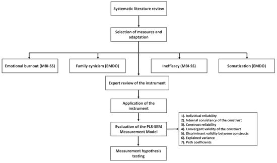 Since the purpose of this work is to start from a robust second-generation statistic with robust tests for the exploration of measures in little explored contexts, to seek to explore causal multi-relations of several latent variables, and to explore the predictive power of the variables [21,34,64], it was chosen to use the Structural Equation Modeling (SEM) technique based on Partial Least Squares (PLS), using the SmartPLS 3 software [46]. The condition to consider a PLS-SEM measurement model valid must consider six criteria: (1) the reliability of the indicators; (2) the internal consistency of the construct; (3) the reliability of the construct; (4) the convergent validity of the construct; (5) the discriminant validity between constructs; (6) explained variance; and (7) the standardized path coefficients. Given the imprecision of Cronbach’s Alpha, it is discouraged as a reliable resource for measurement validation [34,64]. A structural model is established based on the logic of the original instrument by Schaufeli and colleagues [27,28,29] and based on the correlation values between the dimensions of the MBI-SS in recent works [36,37,39] and the antecedent of the correlation results between the dimensions of the Uribe Prado [20]. The research design can be seen in Figure 3.