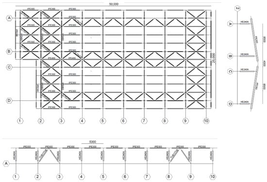 The structural design solutions are developed according to the Italian Code [], and the instructions for wind actions on structures [] and Eurocode 3 [] are adopted on a voluntary base when not in contrast with the Italian Standard. Structural design has been carried out, pushing work rates up to 90% to highly exploit members’ capacity.