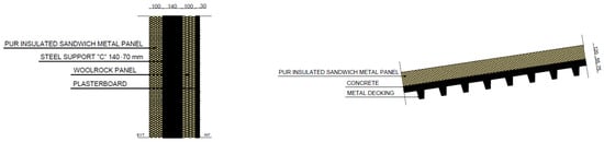 The cladding system for external walls is composed of polyurethane panels, supported by a cold-formed steel stud, rock-wool panels, and a layer of plasterboard; the roof cladding system is a 12 cm commercial double skin panel insulated with polyurethane foam (Figure 2). Connections between panels and structure are rigid, according to the definition given by the Italian Building Code [], and they are considered screwed to the metal studs [].