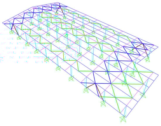 The model of the structure in Figure 4 is created with the software “Seismostruct v6.5”, Produced by SEiSMOSOFT—EARTHQUAKE ENGINEERING SOFTWARE SOLUTION. It includes geometric and material nonlinearities Menegotto-Pinto model [], considered with a fiber approach at the section level. Structural elements are modeled as “inelastic force-based frame elements”, allowing an exact finite element formulation without restraining the displacement field of the element. Connections are either pinned (brace-beam, secondary beam-primary beam) or clamped (column base, beam-column).