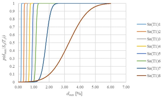 The statistical analysis of IDA curves, based on the analysis of the response of the structure to the seven GMRs, yields the calculation of the cumulative distribution function expressing the probability of exceedance of a certain (transversal direction) given a seismic intensity k, as for Figure 5.