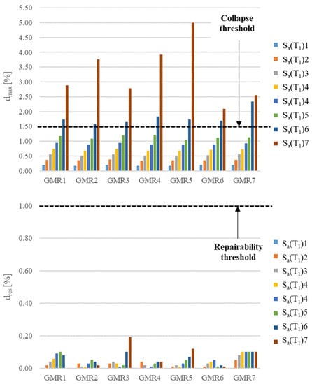 - Two different EDPs are chosen to describe the building’s response to the hazard: the maximum drift of the structure in the weakest direction and the residual drift ratio ; it is assumed that when both and are below certain thresholds, the building is repairable, and single components must be repaired depending on their damage state DS, whereas when or exceed the thresholds, the building is not repairable and must be fully replaced (whatever the local damage state DS of single components);