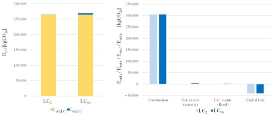 Total extraordinary environmental impacts for LC2 and LC50 are calculated as 262.0 kgCO2e and 4951.7 kgCO2e, respectively, counting for both seismic and flood hazard-related environmental impacts ( and ), respectively.