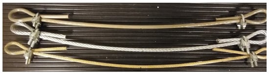 Rope no. 1 was a steel wire rope without a polyamide casing. The remaining two ropes were covered with polyurethane material. This solution is used in industry to increase the adhesion of the ropes to the friction wheel, thus increasing the friction. Each rope had a different structure and number of strands—research on this will be the subject of other studies. We selected this combination of ropes due to the different diameters of the metallic cross section of the individual ropes: no. 1: 6 mm, no. 2: 5 mm, no. 3: 4 mm (Figure 1).