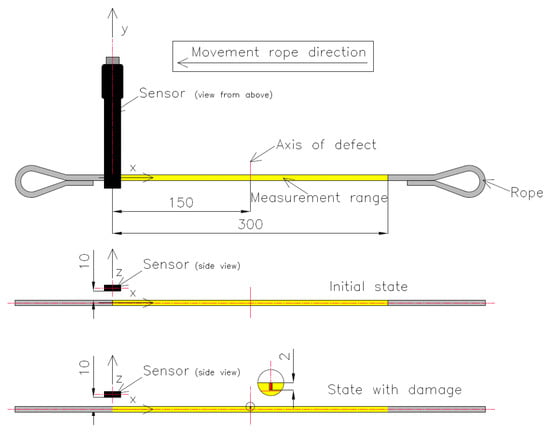 The three components of induction were recorded ten times for this state. The mean of all values was used for the final analysis. Then, centrally in the middle of the rope, a discontinuity was introduced (we cut the rope) to a depth of approx. 2 mm (Figure 3). All recorded signals for the rope with discontinuity are marked as _D.