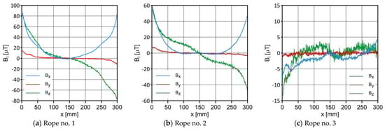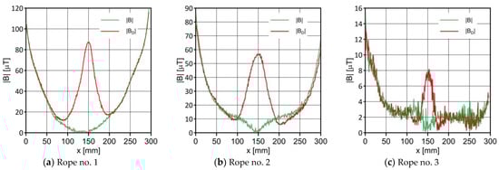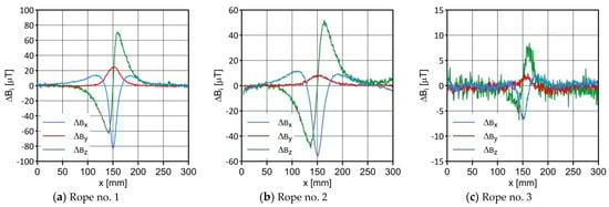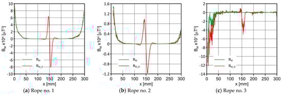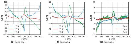 Regardless of the initial state of the wire rope magnetism, the damage caused a change in the measured signal. For ropes no. 1 and no. 2, the diagnostic signal was evident; for rope no. 3 there was a lot of noise. This was most likely due to the minor diameter of the metallic cross section. Further research will allow us to determine whether the rope structure could have caused this result. The signal’s shape resembled a peak for the x component (tangent along the measurement direction). The y component (the tangent perpendicular to the measurement direction) was also a peak but with a value several times smaller. On the other hand, the z-component signal (normal) resembled a sine waveshape.