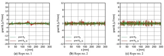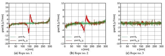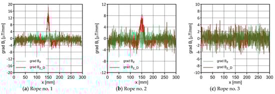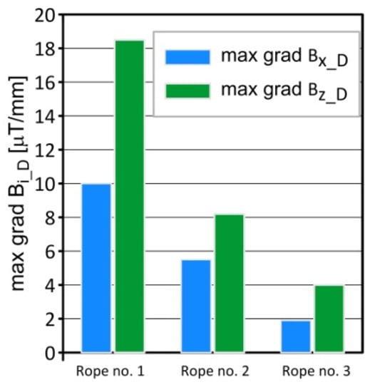 Figure 7, Figure 8, Figure 9, Figure 10, Figure 11, Figure 12, Figure 13 and Figure 14 show a comparative analysis of the signal with and without failure. Figure 7, Figure 8 and Figure 9 show the distribution of the gradient of the induction components. There is a clear influence of the defect on the distribution of the gradient values, which increased in the immediate vicinity of the introduced defect. The most significant differences appeared for the grad Bx_D and grad Bz_D; grad By_D showed no significant changes. The maximum values of the gradients for all the tested ropes are shown in Figure 16.