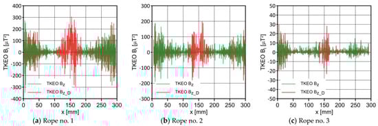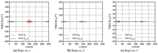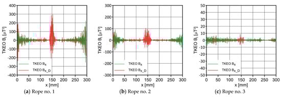 The results of the obtained measurements are shown in Figure 4, Figure 5, Figure 6, Figure 7, Figure 8, Figure 9, Figure 10, Figure 11, Figure 12, Figure 13 and Figure 14. Figure 4 shows the recorded signals for the initial state, and Figure 5 shows the signals for ropes with introduced discontinuity. Figure 6 shows the difference in the values between the signal for damaged ropes and their initial state (). Figure 7, Figure 8 and Figure 9 show the distribution of gradients for the induction components: x, y, and z. Similarly, Figure 10, Figure 11 and Figure 12 show the TKEO analysis for the induction components: , , and . Figure 13 illustrates the signal modules calculated as. On the other hand, in Figure 14, one can observe a new variable not encountered before in diagnostics, determined by the product of the signals from all three induction components .