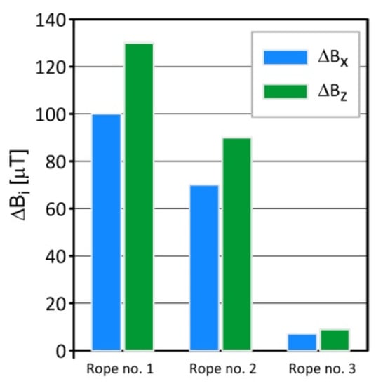 - Mazurek, P.; Roskosz, M. Influence of the Earth’s magnetic field on the diagnosis of steel wire rope by passive magnetic methods. J. Magn. Magn. Mater. 2021, 547, 168802. [Google Scholar] [CrossRef]