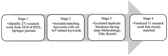 Several research efforts have focused on data security and privacy for IoT devices. For this research, 271 research studies published after 2018 were shortlisted from IEEE, Springer, and other referred journals. These papers focused on IoT security, threat modeling, IoT framework, data sensitivity, privacy, and device security. The authors followed a four-stage selection and rejection process by including only the relevant keywords, results, and methodology-based research work to finally shortlist 31 papers, as illustrated in Figure 1.